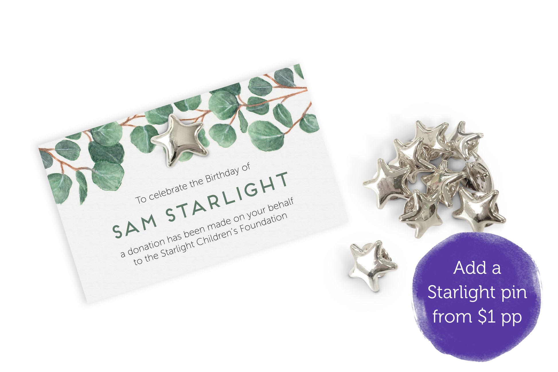Every Starlight Bonbonniere comes with a personalised 90 x 52mm card with optional Starlight pin ready for you to attach. Minimum order of 50 cards applies.