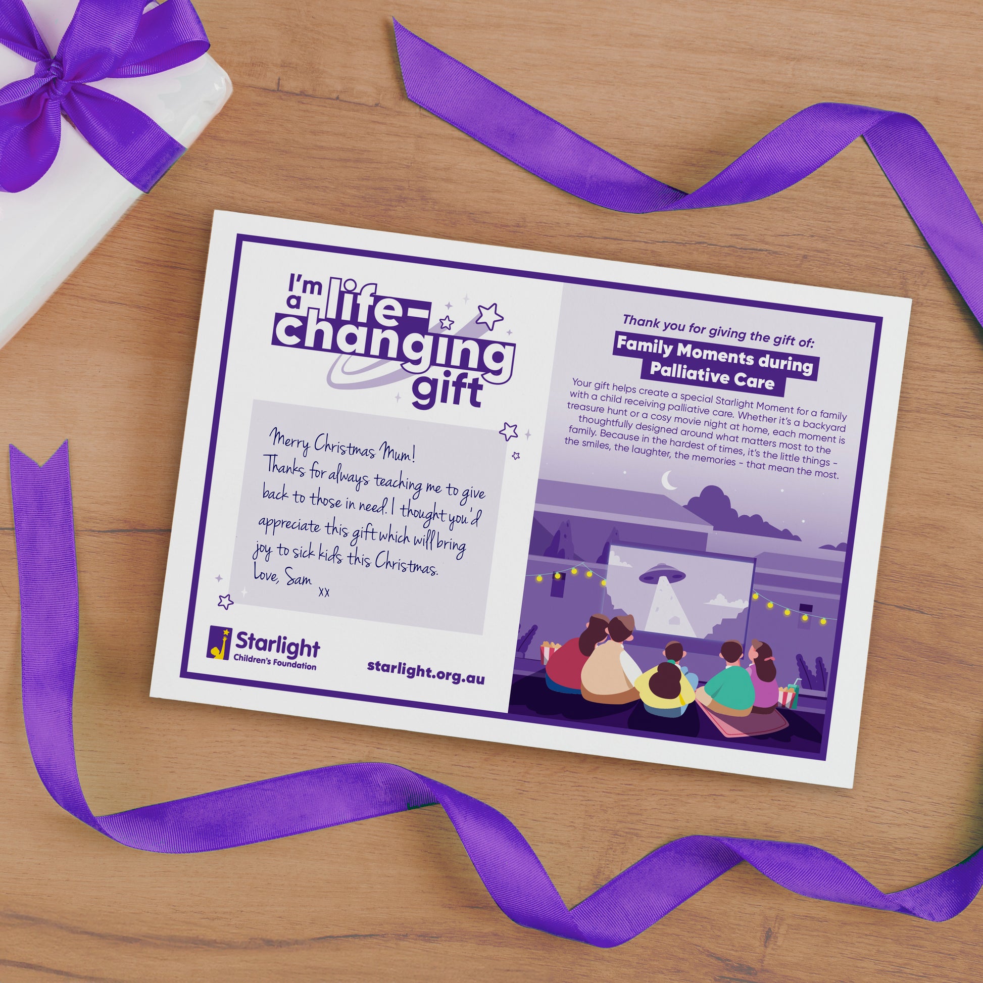 Your gift helps create a special Starlight Moment for a family with a child receiving palliative care. Whether it’s a backyard treasure hunt or a cosy movie night at home,