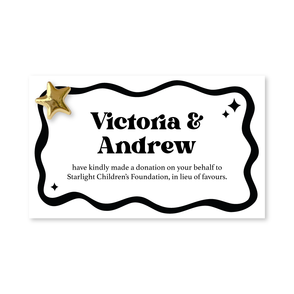 Each favour includes a beautifully designed 90 x 52mm card, personalised with your names and the option to add a Starlight keepsake pin — perfect for guests to take home and treasure.