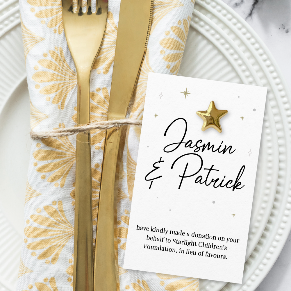 Each favour includes a beautifully designed 90 x 52mm card, personalised with your names and the option to add a Starlight keepsake pin — perfect for guests to take home and treasure.
