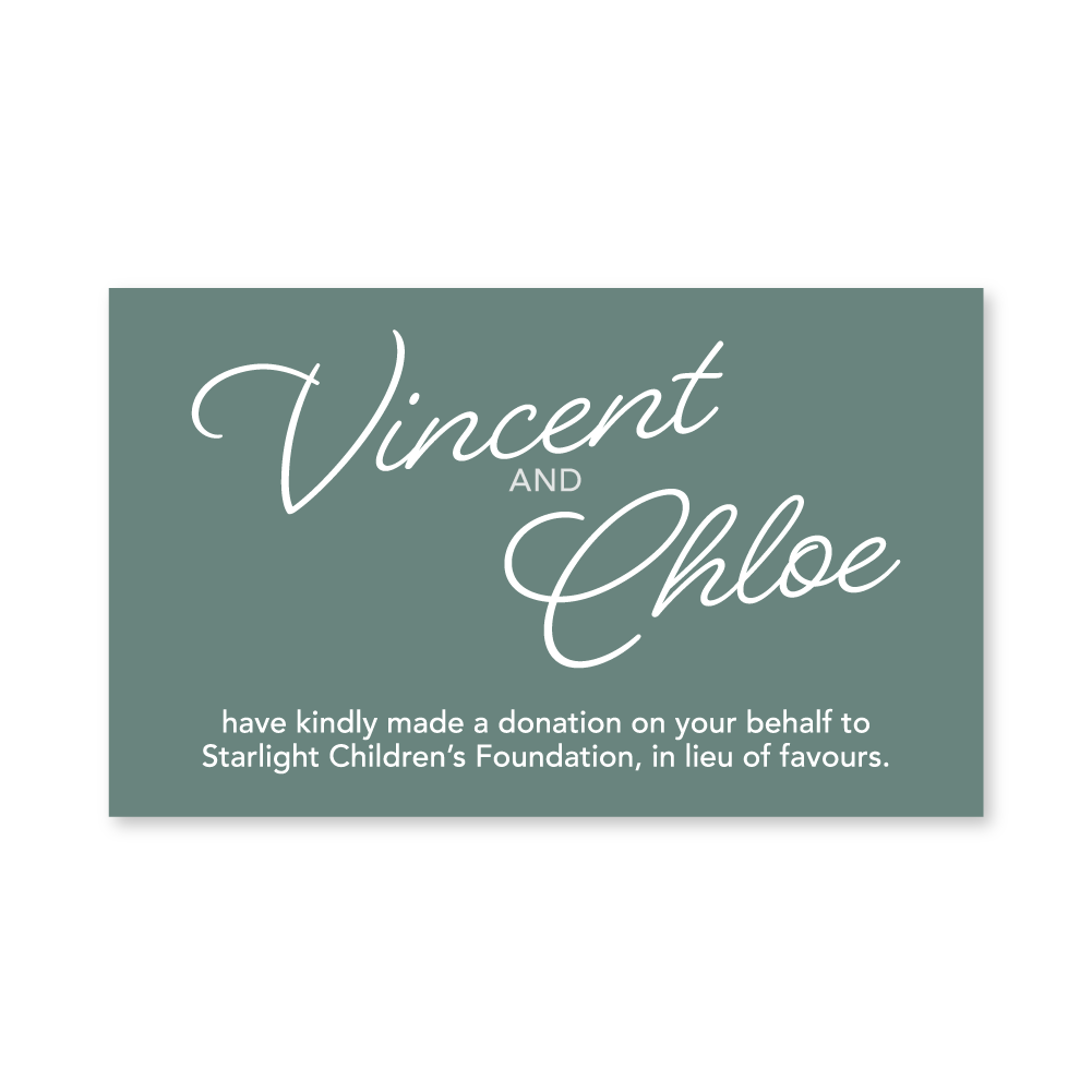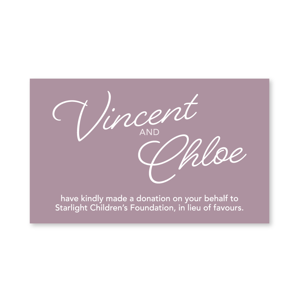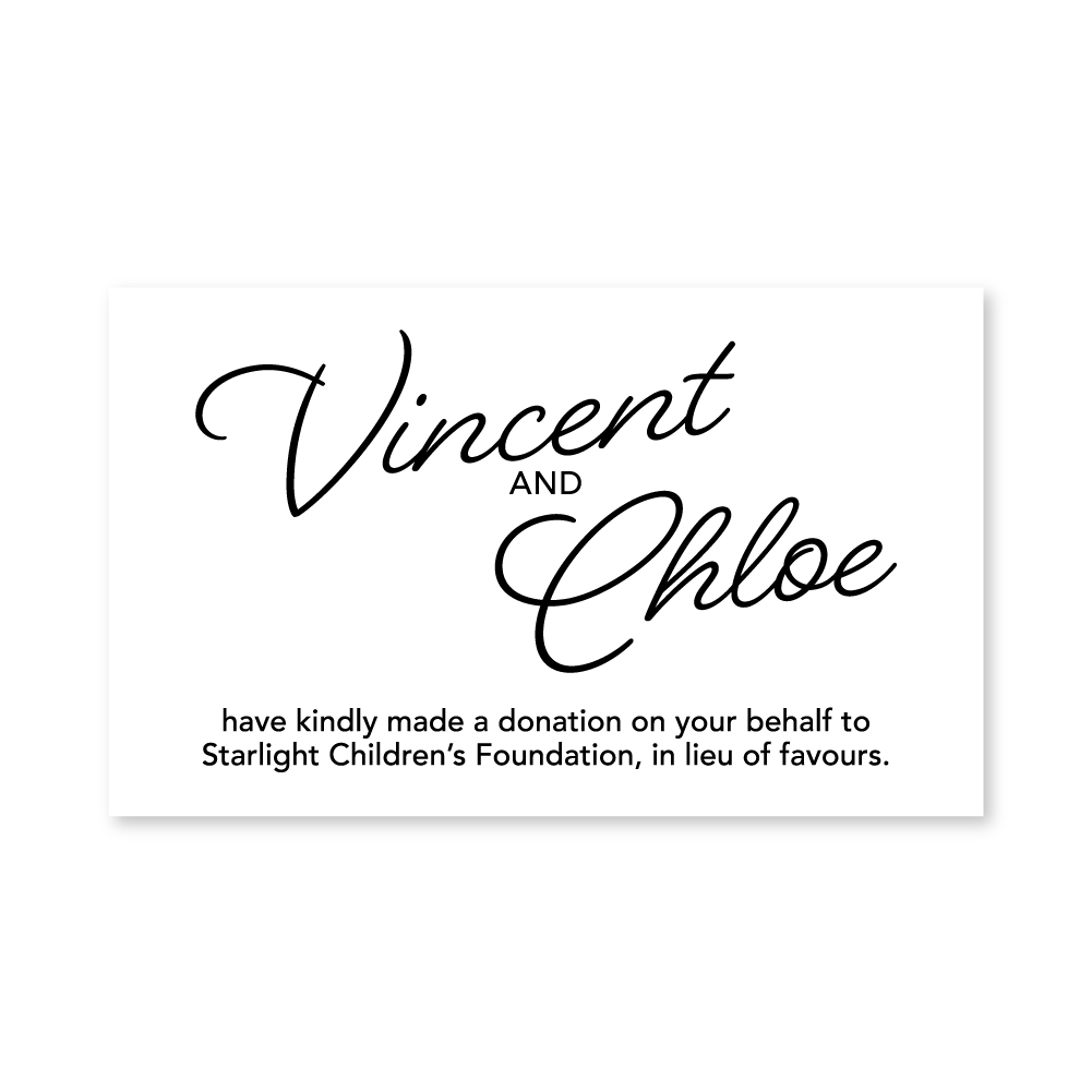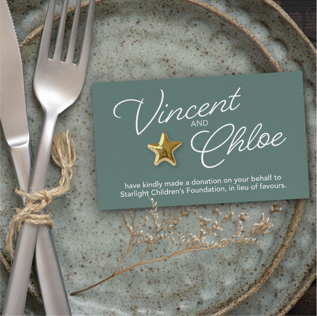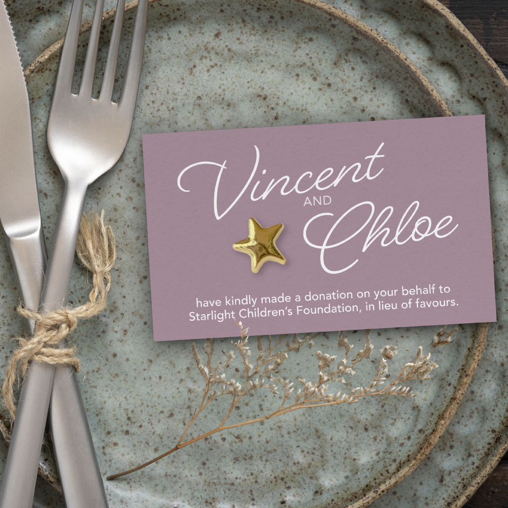Each favour includes a beautifully designed 90 x 52mm card, personalised with your names and the option to add a Starlight keepsake pin — perfect for guests to take home and treasure.